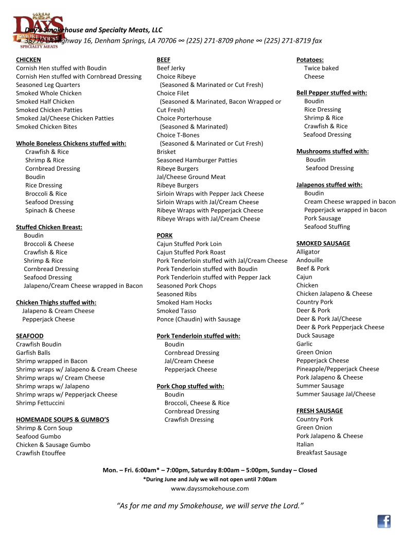 Welcome to Day's Smokehouse & Specialty Meats, where contemporary flavors meet Cajun traditions in the heart of Denham Springs, Louisiana. This cozy establishment specializes in a delightful array of smoked meats and homemade specialties that are sure to satisfy any craving.